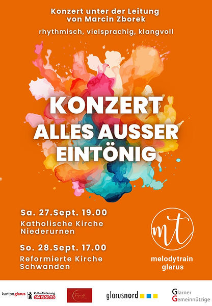 Der MelodyTrain Glarus ist ein gemischter Chor mit über 40 motivierten und leidenschaftlichen Sängerinnen und Sängern. Mit unserem neuen Chorleiter Marcin Zborek proben wir einmal pro Woche für 90 Minuten intensiv und ambitioniert für unsere Konzerte, Gottesdienstbegleitungen, Hochzeiten, Familienfeste, Gesangsfeste ect. Wir sind offen für neue Erfahrungen und Ideen!